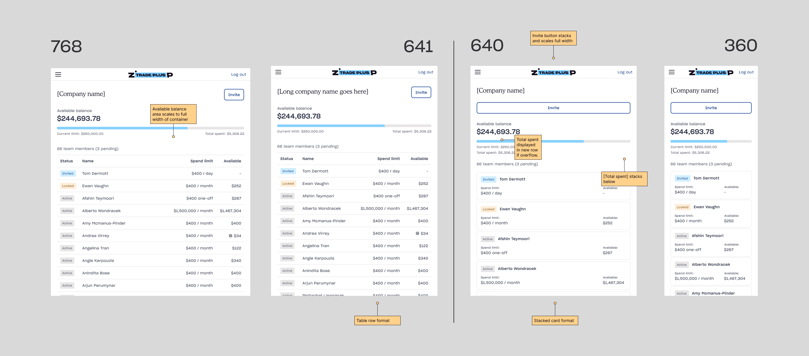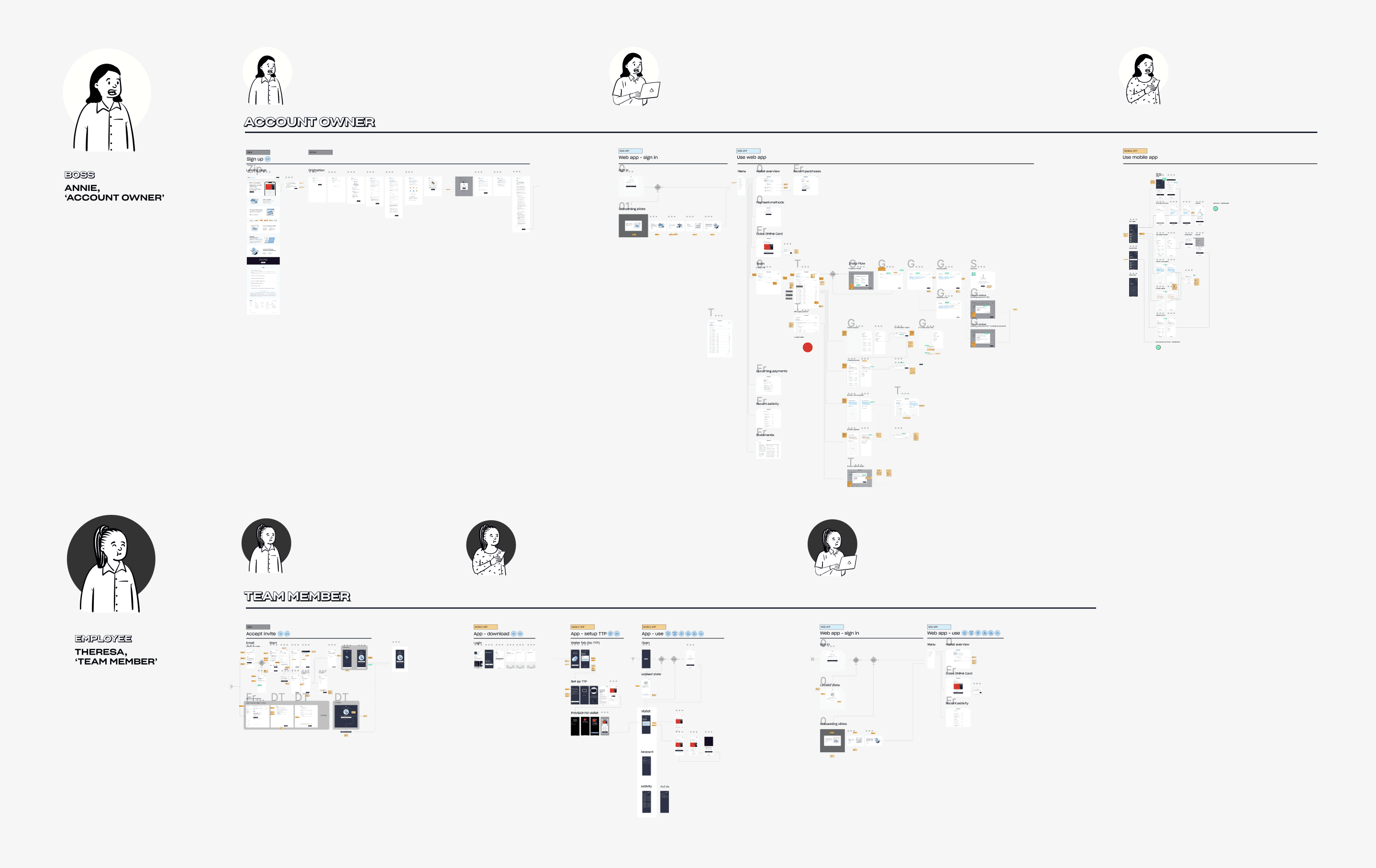 Screens were designed in multiple states to ensure page layouts would accomodate and persist across multiple permissions and feature-sets. Phases too were mapped out to eliminate design-debt and help drive development decisions at a UI level.