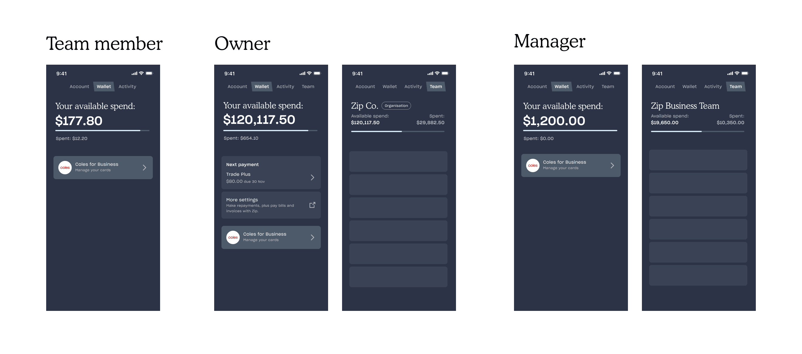 With Zip Business being a mobile app-centric service, core spend management features and controls also needed to be accessible through the app. For initial phases all functionality was to be included, however the prioritization of features in planned future phases was determined using workshops and scoped out on design files and flows.